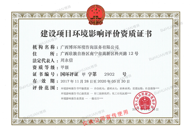 廣西博環環境咨詢服務有限公司系國有控股上市公司博世科( 股票代碼:300422)控股子公司,總部位于廣西南寧市,持有原生態環境部頒發的甲級建設項目環境影響評價資質證書(證書編號:國環評證甲字第2902號)、環境咨詢(環保管家)服務一級認證證書、環保工程專業承包叁級證書。公司是國家高新技術企業、 廣西科技型中小企業、廣西工業節能與綠色發展評價中心、廣西工業固體廢物資源綜合利用評價機構、廣西排污許可工作技術單位、廣西新增戰略性新興產業企業、廣西瞪羚企業、南寧市“專精特新”中小企業等。